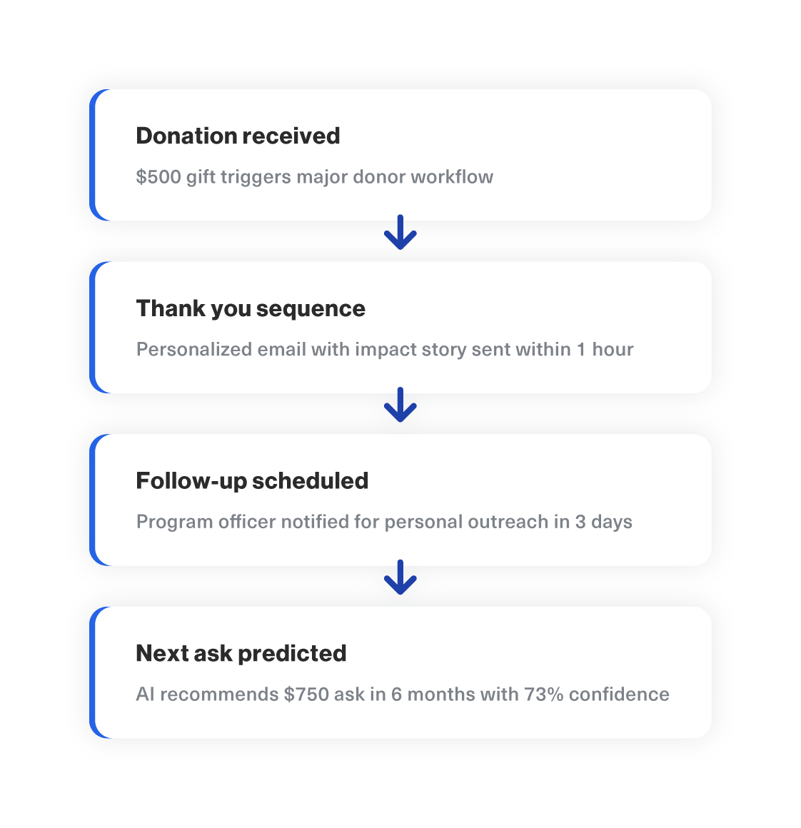 Nurture your donor relationships with mobile forward communications. Send push notifications and emails in real time or on a specific date. Trigger content when donors reach giving milestones.
