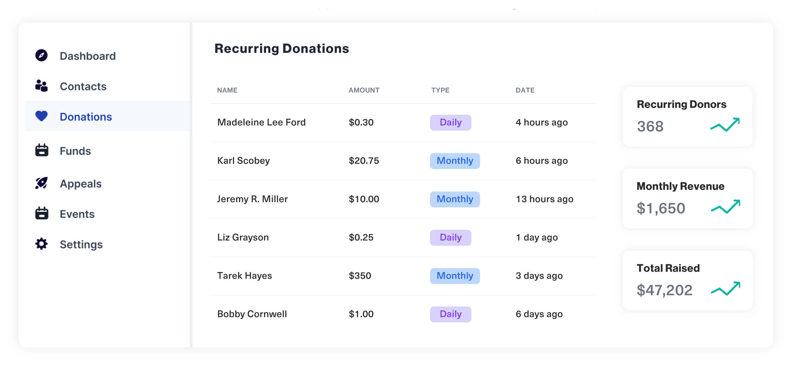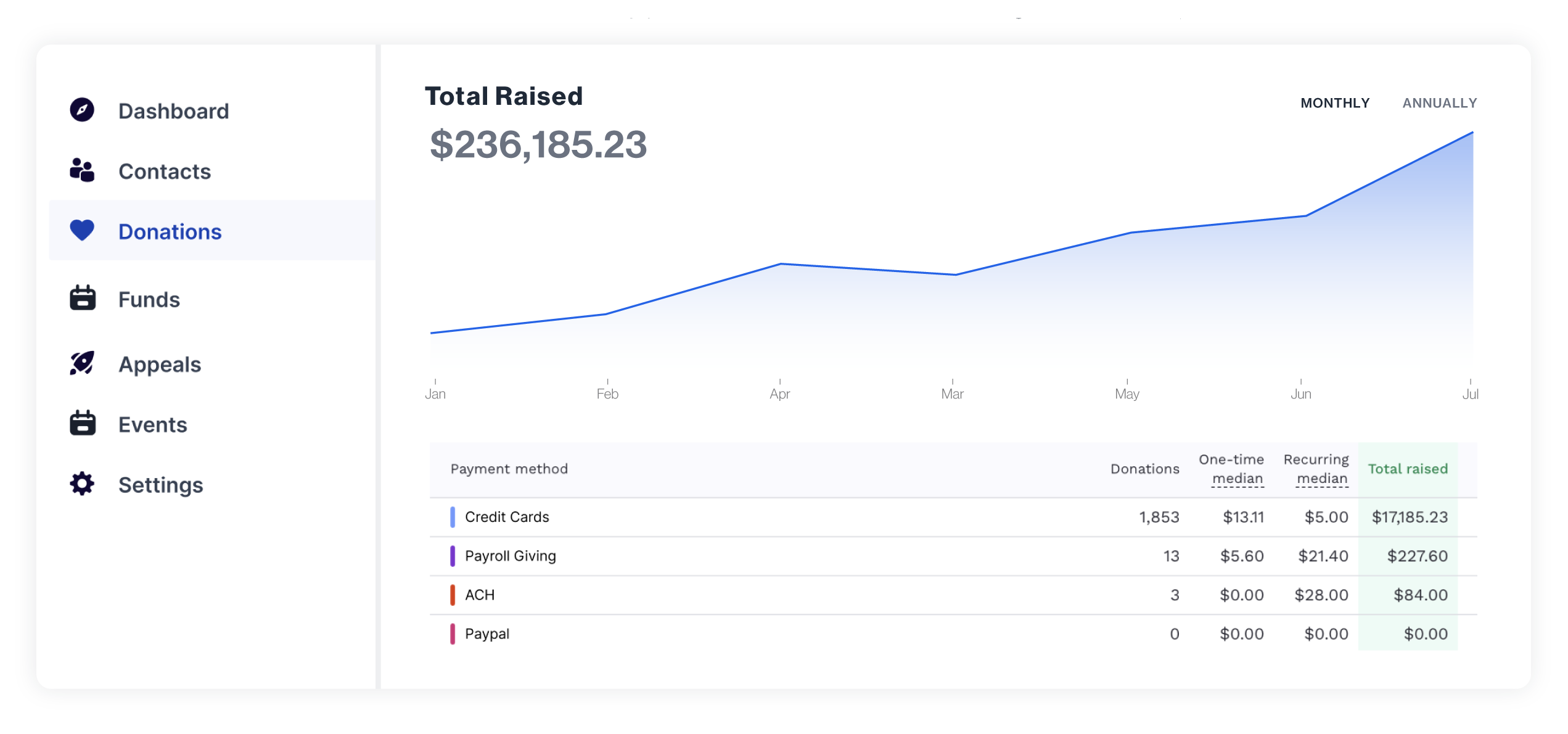 Visualize your growth with month to month analytics. Easily manage members, donors, donation history, campaigns, your brand settings and more.