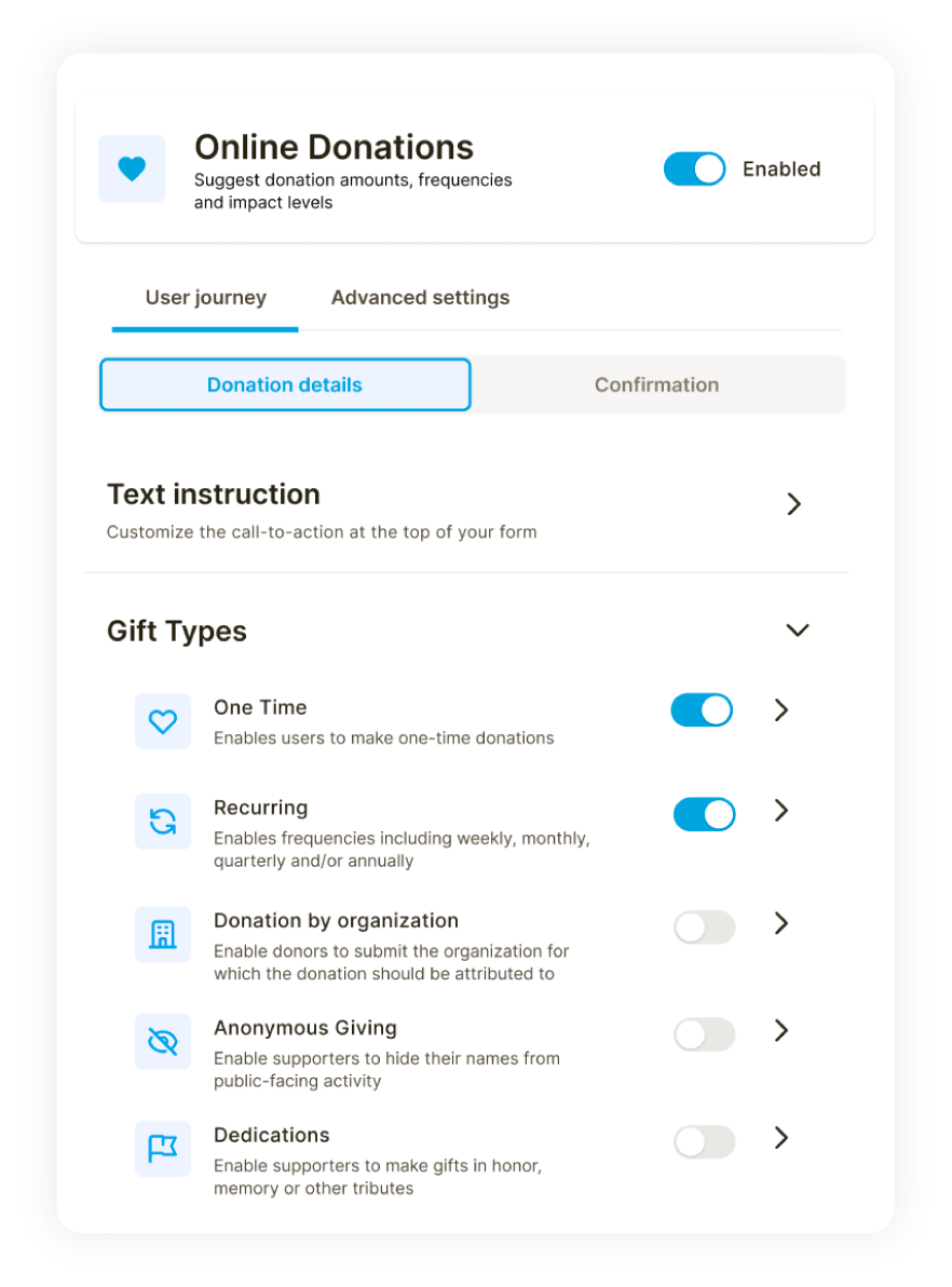 Create fund designations for chapters, channels, or affiliate organizations. Track the performance of campaigns, events and peer-to-peer pages for your specific designations.