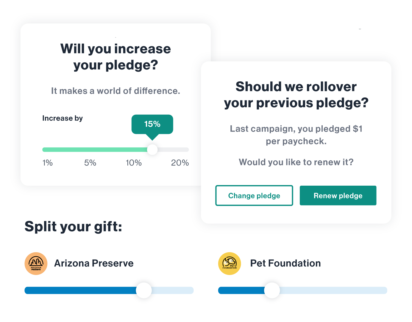 Give employees flexibility with customizable pledge frequencies aligned to pay periods. Encourage dollar amounts or percentage-of-salary donations with calls to action that resonate with your culture.